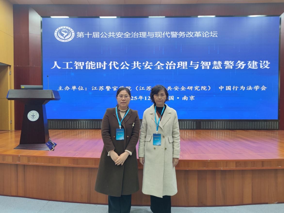 2025年12月5日,由江苏警官学院、中国行为法学会主办,江苏警官学院承办的”第十届公共安全治理与现代警务改革论坛”在江苏南京召开。我院犯罪心理学教研室主任赵晓风副教授,侦查学教研室王晓红博士,应邀前往参会研讨,与来自全国各地的公安警察院校的学者专家,公安警务部门的干警们一起研讨AI时代的公共安全治理与智慧警务建设。