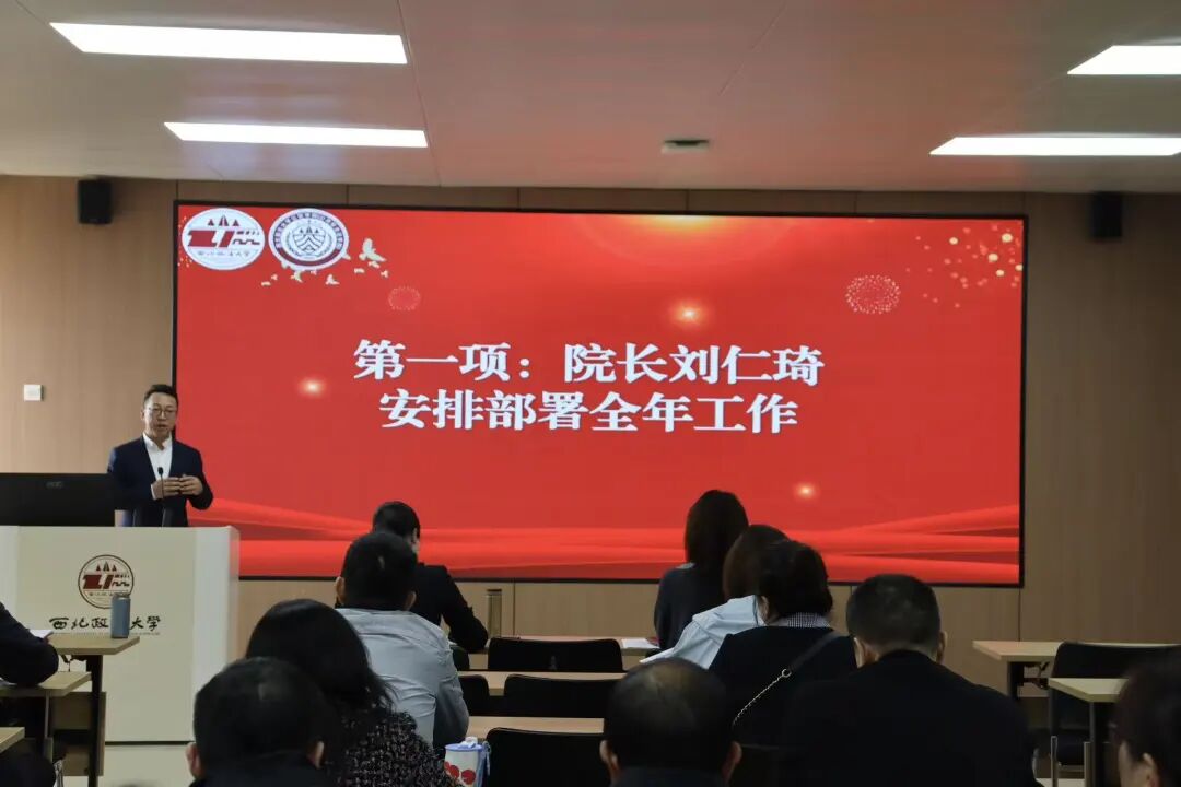 会上,刘仁琦院长首先代表学院总结了2025年工作,并对2026年学院整体工作进行了全面部署。刘院长深入分析了学院当前面临的发展机遇与挑战,强调全体教职工要紧密围绕学校发展核心目标,坚持立德树人根本任务,以提升人才培养质量为核心,以深化综合改革为动力,优化学科专业布局,强化师资队伍建设,提升内部治理效能,凝心聚力、锐意进取,共同推动学院各项事业高质量发展。